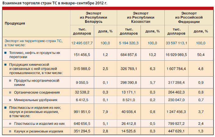 Следует отметить, что среди трех стран ТС доля химической продукции в общем экспорте самая высокая именно у Казахстана — 6,3% (по данным за 9 месяцев 2012 года). Но более 90 % в этом объеме приходится на продукты неорганической химии. Аналогичная структура экспорта наблюдается и в поставках из Казахстана в третьи страны.