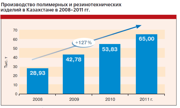 Следует отметить, что, несмотря на отсутствие в стране полимерной отрасли как таковой, сектор переработки развивается достаточно активно: в Казахстане расположено около 46 крупных и средних предприятий, работающих в сфере производства резиновых и пластмассовых изделий. Развито производство полимерных труб, различных утеплителей, сэндвич-панелей, полимерной упаковки и т. п. Крупнейшими производителями РТИ (конвейерных лент) в бывшем СНГ остаются компании ТОО «Сараньрезинотехника» и ТОО «Карагандарезинотехника».