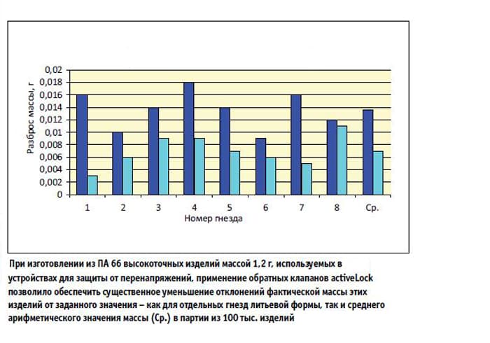 Надежность технологического процесса и обеспечения качества изготавливаемых изделий в компании Dehn + Soehne GmbH & Co. KG (город Ноймаркт) стоит на первом месте. Деятельность этой семейной компании сконцентрирована на трех областях применения выпускаемой продукции: защите от перенапряжений, защите от ударов молний (заземление) и охране труда. На литьевой машине модели IntElect 50-110 (усилие смыкания – 500 кН, диаметр шнека – 25 мм), оснащенной литьевой формой с 8 горячими каналами, компания Dehn в рамках программы тестирования обратных клапанов activeLock изготавливала из полиамида (ПА) 66 среди прочего используемые в устройствах для защиты от перенапряжений высокоточные изделия массой 1,2 г. По сравнению с кольцевыми обратными клапанами применение клапанов activeLock позволило обеспечить существенное уменьшение отклонений массы изготавливаемых изделий от заданного значения. Измерения выполнялись как для отдельных гнезд литьевой формы, так и в среднем для партии из 100 тысяч изделий. В результате было установлено, что использование обратных клапанов activeLock позволило почти в два раза снизить среднее арифметическое значение колебаний массы деталей.