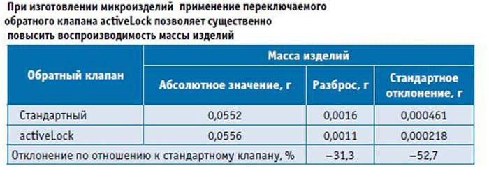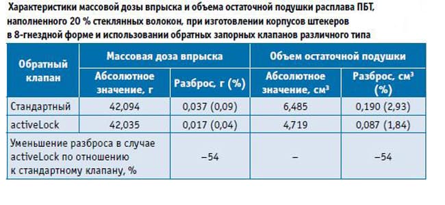 Обычно среднее уменьшение колебаний величины объема остаточной подушки материала, достигаемое в результате применения обратного клапана activeLock, находится в пределах от 30 до 50% и более, что подтверждают результаты, полученные на примере литьевых корпусов штекеров из стеклонаполненного ПБТ. В дополнение к этому стабильное закрывание обратного клапана способствует достижению воспроизводимых значений давления в гнездах литьевой формы, что в свою очередь сопровождается снижением колебаний плотности, степени кристалличности и усадки изготавливаемых изделий, а следовательно, обеспечивает минимальные отклонения их размеров.