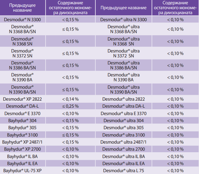 Таблица 1. Линейка продуктов Desmodur ultra. Эффект от использования и химический состав продуктов