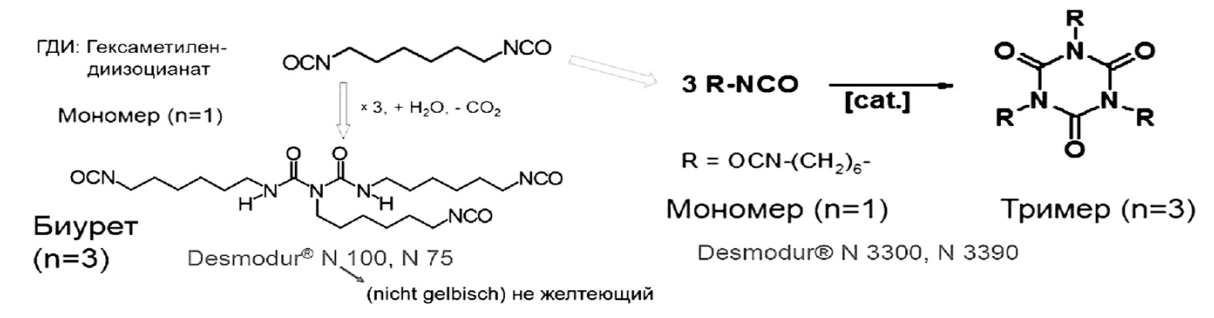 В результате развития технологии химического синтеза и ужесточения требований рынка (улучшение УФ- и химической стойкости, снижение вязкости) был разработан технологический процесс промышленного получения тримера (изоцианурата) ГДИ, впервые появившегося на рынке в 1986 году под маркой Desmodur® N 3300. Для снижения вязкости и облегчения обращения с этим продуктом был выпущен 90 % раствор тримера ГДИ в органическом растворителе, ставший популярным под маркой Desmodur® N 3390 (рисунок 1).