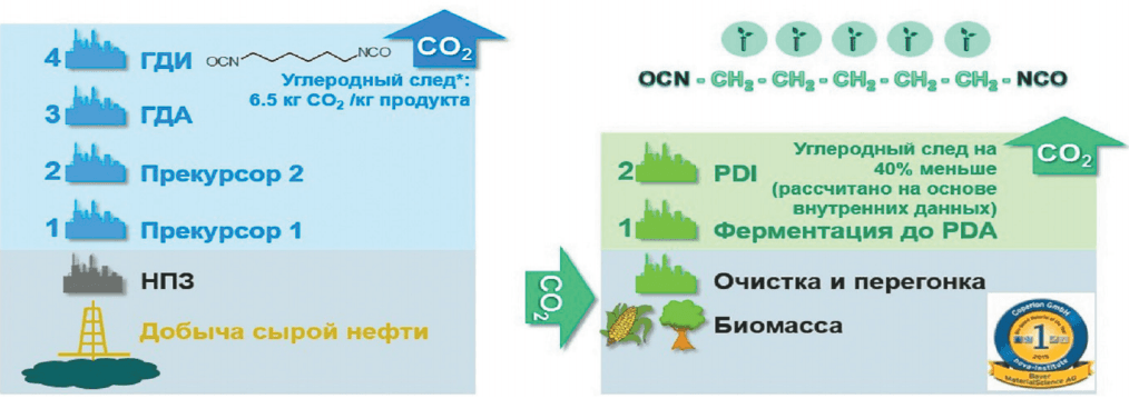 В 2015 году на выставке European Coatings Show в г. Нюрнберг (Германия) представлен Desmodur ® eco N 7300 – первый коммерческий изоцианурат (тример) ПДИ, синтезированный из пентаметилен-диамина (кадаверина). Последний получен биотехнологическим путем из биомассы растительного происхождения (кукурузного крахмала). Новый мономерный диизоцинат позволяет получать производные (в частности, изоцианураты), мало отличающиеся по свойствам от гомологов на основе ГДИ. При сопоставимых потребительских свойствах ПДИ и его производные оставляют на 40 % менее массивный «углеродный след» по сравнению с продуктами на основе ГДИ (рисунок 3).