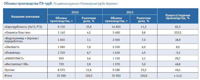 Полиэтиленовые трубы в Украине выпускают более 70 предприятий, однако крупных игроков, способных производить свыше 1 тысячи тонн продукции в год, – меньше десятка. Небольшие предприятия, как правило, кроме труб, выпускают еще несколько видов продукции, среди которых полимерным трубам отводится вспомогательная роль. За их счет такие предприятия расширяют ассортимент и диверсифицируют свои доходы. Такие предприятия выпускают трубы небольшими партиями и реализуют их на местных рынках. Сегментом рынка ПЭ-труб уверенно заправляют около 5 крупнейших компаний – им принадлежит 70% выпускаемой продукции. Это такие компании, как «Евротрубпласт» (РТЗ, КаТЗ), «Планета-Пластик», «Водполимер», «Эльпласт», «Поливтор». Основным игроком по-прежнему остается Торговый дом «Евротрубпласт» (Рубежанский и Калушский трубные заводы). В 2011 году эта компания произвела 14 850 т ПЭ-труб различного назначения, таким образом, ее рыночная доля составила 41,3 %. Компания «Эльпласт», занимавшая в 2010 году. почетное 2-е место, утратила в 2011 году две позиции и переместилась на 4-е место. А потеснила ее «Планета-Пластик» – в 2011-м ее производство выросло более чем в 2 раза и достигло 3 460 тонн ПЭ-труб, что позволило ей захватить почти 10% рынка. Такие разительные перемены произошли благодаря смене владельца - им стало ОАО «Мироновский хлебопродукт», которое использует пластиковые трубы преимущественно для внутренних нужд компании. Многие компании – хорошие середнячки рынка, такие как «Розма» и «Укрполимерконcтрукция», – в прошлом году снизили производство более чем на 40%.