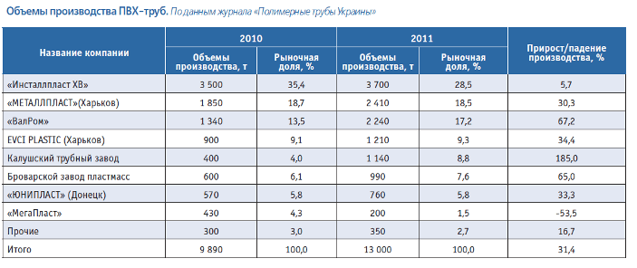 ПВХ-трубы. Объемы производства ПВХ-труб за последний год выросли на 31% и почти сравнялись с докризисными объемами. Спрос на эти изделия остается стабильно высоким, что и позволяет наращивать объемы их производства. Состав ведущих отечественных производителей ПВХ-труб в 2011 году претерпел существенные изменения. Лидер сегмента по итогам 2010 году, компания «Инсталпласт-ХВ», в 2011 году резко снизила прирост производства, который составил всего 5,7%, хотя предприятию и удалось сохранить за собой первенство по объемам производства. А Калушский трубный завод, который в 2010 году не производил и 500 тонн ПВХ-труб, в 2011-м вышел на свои проектные мощности и всего за год увеличил объемы производства в 3 раза, что поставило его в пятерку крупнейших игроков этого сегмента рынка. Харьковский «МЕТАЛЛПЛАСТ» стабильно удерживает 2-е место среди крупнейших производителей. А некоторым довольно крупным компаниям пришлось и вовсе свернуть производство. Так, компания «МегаПласт» (Луганск) в минувшем году объявила о приостановлении своего производства труб из ПВХ и к концу