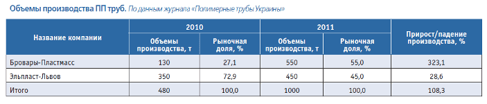 года пришла с показателем минус 53,5 %. ПП-трубы. Наиболее заметно выросло производство ПП-труб - более чем в 2 раза. В Украине этот вид продукции производят только два предприятия – «Бровары-Пластмасс» и «Эльпласт-Львов», причем если в 2010 г. лидировало последнее, то в 2011 году благодаря значительному приросту объемов выпущенной трубы в лидеры вышел «Бровары-Пластмасс».