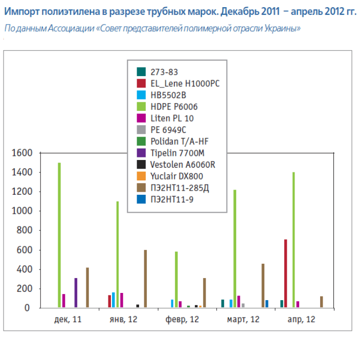 видами полимеров иногда более чем в два раза. Полиэтилен импортируется в Украину в достаточных количествах - за 5 месяцев (декабрь 2011 – апрель 2012) доля трубных марок в общей структуре импорта полиэтилена составила 8%, или почти 9,5 тысяч тонн. Таким образом, трубная группа является одной из наиболее крупных и занимает 4-е место в импорте полиэтилена за указанный период. Самым крупным импортером полиэтилена в Украину являются страны Европейского региона. Поставляемые оттуда объемы полиолефинов практически в 2 раза превышают