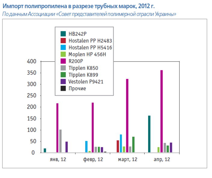 ПП. По импорту трубных марок полипропилена (ПП) страны Азии взяли реванш – объемы поставляемого из этого региона сырья более чем в 3 раза превышают объемы поставок из стран Европы. Среди импортируемых марок полипропилена на первом месте с большим отрывом находится R200P южнокорейского производителя Hyosung, которая лидирует в каждом месяце по объемам ввоза в Украину. Импорт трубных групп в общей структуре импорта полипропилена занимает 4-е место по объему ввоза в Украину – почти 2 тысяч тоннт (7%). ПВХ. Центральным событием 2011 году запуск на «Карпатнефтехиме» линии по производству поливинилхлорида – единственной в Украине. В сентябре 2011 году компания вышла на проектные мощности по выпуску этого вида