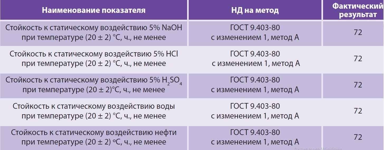Стойкость к статическому воздействию жидкостей в соответствии с Протоколом испытаний № 002ПИ-2015 от 29.01.15 ЗАО НПО «Лакокраспокрытие» (г. Хотьково)