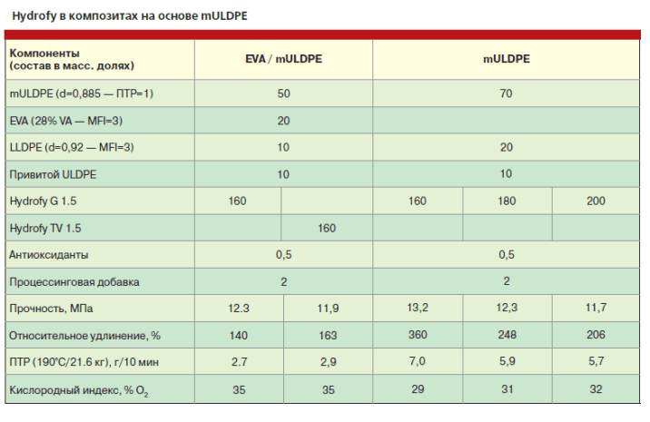 Полиэтилен из-за своей высокой кристалличности невозможно использовать в качестве базового полимера, так как он не может принять столь значительное количество наполнителя. Поэтому базовым полимером для промышленных безгалогенных композиций являются, в основном, сополимеры этилена: этилен-винилацетат (EVA), этилен-акрилатные полимеры (EMA, EEA, EBA), металлоценовые этилен-октен сополимеры (mULDPE) и этилен-пропиленовые сополимеры (EPR/EPDM). Исследования, проведенные в компании Нуова Сима С.р.л. (Nuova Sima S.r.l.), показали, что металлоценовые сополимеры позволяют улучшить механические свойства композиции даже при высоком наполнении более 150 массовых частей.