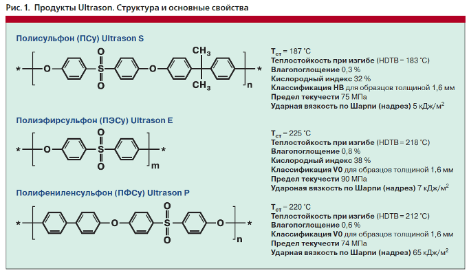 Ultrason S (ПСу) используют, как правило, если требования к теплостойкости относительно невелики, и необходимо низкое влагопоглощение. Ultrason Е (ПЭСу) незаменим при высоких требованиях к теплостойкости, огнестойкости и физико-механическим показателям, или в случае, когда изделия находятся в контакте с неполярными растворителями (бензин, масла, смазки и т. д.). Ultrason Р (ПФСу) является предпочтительным материалом, если необходима очень высокая стойкость к растрескиванию, высокая ударная вязкость и огнестойкость. Компания BASF разработала ряд материалов для конкретных заказчиков. Так, для изготовления забрала пожарного шлема был использован Ultrason Е2010 НС. Материал обладает высокой неотъемлемой огнестойкостью (без добавления антипиренов) хорошей ударной вязкостью. Кроме того, он прозрачен, термически стабилен, устойчив к гидролизу и воздействию химикатов.