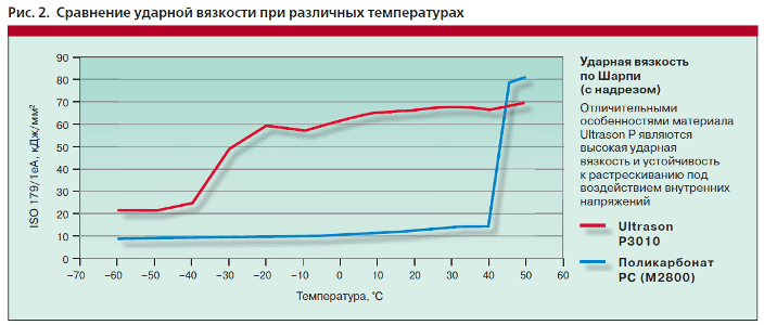 В дополнение к описанным выше преимуществам пластиков Ultrason продукты семейства Ultrason Р обладают также высокой ударной вязкостью и устойчивостью к растрескиванию под воздействием внутренних напряжений, что делает возможным их использование для изготовления санитарно-технического оборудования (фиттинги), в авиастроении (панели элементов интерьера) и кейтеринге (ударопрочные подносы). При сравнении ударной вязкости Ultrason Р 3010 и поликарбоната первый материал показывает значительные преимущества. В продуктовой линейке Ultrason компании BASF также представлены армированные материалы, которые с успехом могут заменять металлы в определенных сферах применения.