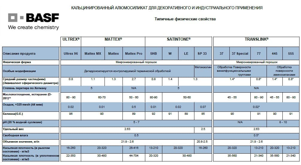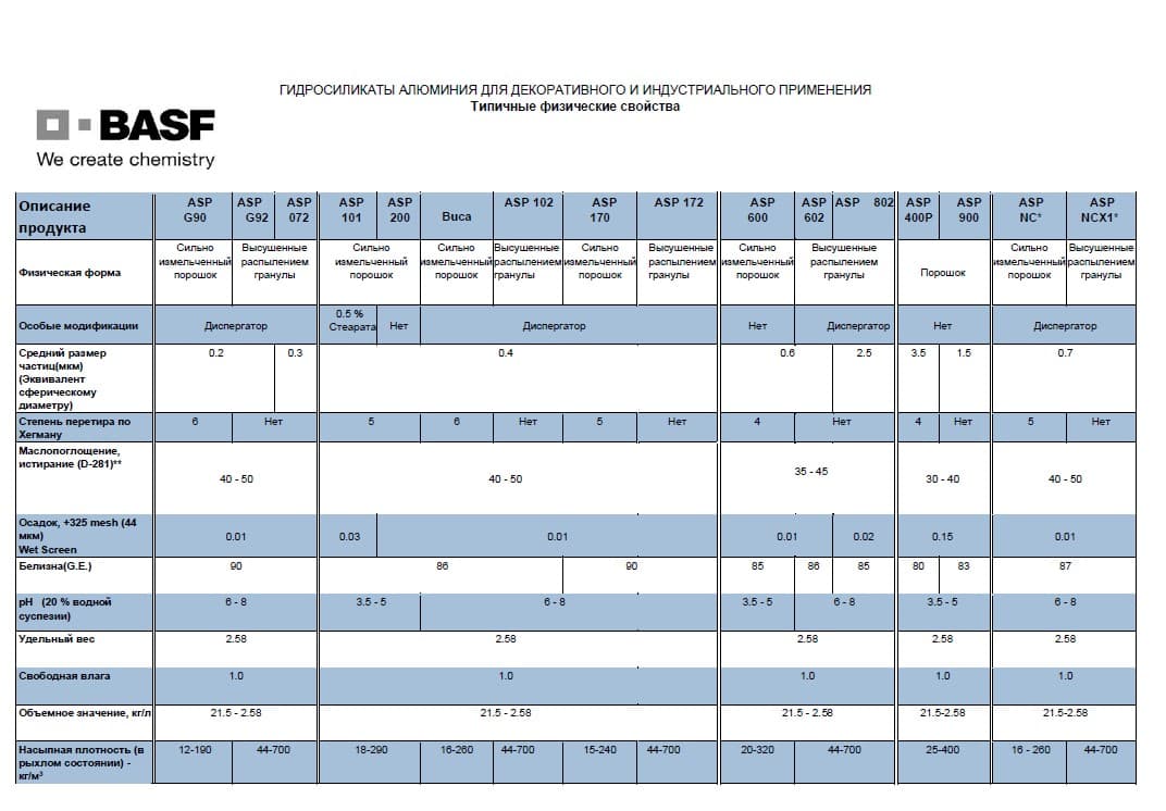 Компания BASF предлагает следующие типы обогащенных каолинов: гидратизированный (отмытый), деламинированный и кальцинированный