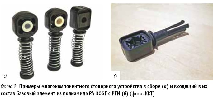 Многокомпонентное стопорное устройство включает в себя базовый элемент из наполненного 30% масс. стеклянных волокон полиамида PA 30GF и расположенную внутри него втулку, которая может соединяться с базовым элементом либо непосредственно в ходе литья под давлением, либо на последующей стадии сборки. Втулка заключена в эластомерную оболочку массой 5 г, изготавливаемую из бутадиенакрилонитрильного каучука (NBR). Узел содержит также металлическую пружину и дополнительные пластиковые элементы (фото 2). В целом же фиксирующее устройство состоит из 7 элементов, а кулиса переключения передач – из 32 деталей. Оба узла компания ККТ поставляет в собранном виде непосредственно на сборочные конвейеры группы компаний VW.