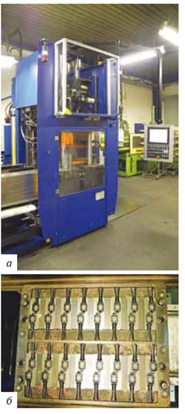 В отношении технического оснащения производства РТИ фирма ККТ уже долгие годы ориентирована на литьевое оборудование австрийской фирмы MAPLAN GmbH (г. Тернитц), машина которой модели MTF 2500/280 ergonomic с сенсорной системой управления PC 5000 как раз и была использована для реализации поставленной задачи (фото 3, а). Многокомпонентное стопорное устройство изготавливается в (2×32)-гнездной литьевой форме (фото 3, б). В то время как оператор загружает 32 гнезда формы втулками и полиамидными элементами, на другой станции той же машины осуществляется собственно литье под давлением РТИ. При времени цикла, равном 4 мин, оператору приходится быть весьма проворным. «В ближайшее время мы совместно с нашими партнерами из MAPLAN разработаем необходимые средства автоматизации, чтобы сделать процесс независимым от оператора – при таком большом количестве выпускаемых изделий это себя, несомненно, оправдает, – отмечает К. Д. Вале. – Наши литьевые формы оснащены оптимизированными холодноканальными системами с короткими путями течения расплава, обеспечивающими экономный расход материала и минимальное количество отходов. Кроме того, машины от MAPLAN отличаются сниженным энергопотреблением и удобством обслуживания. Их энергоэффективность обусловливается использованием сервогидравлической системы CoolDrive II и энергосберегающих термостатирующих устройств DCI».