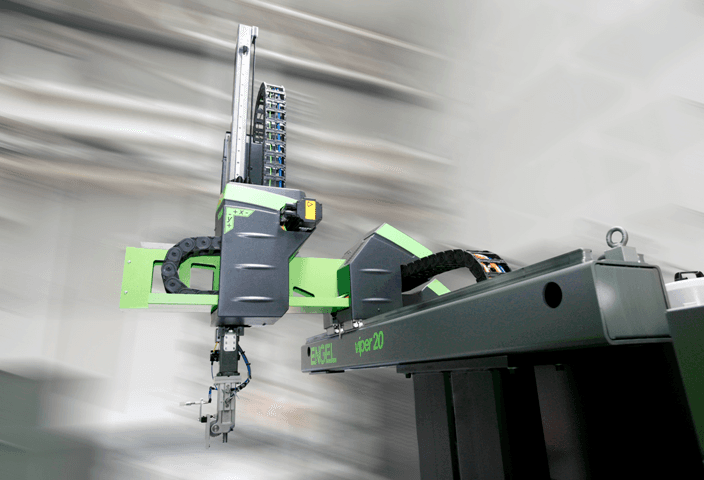 Еще одно выгодное обстоятельство для рассматриваемой конструкции литьевой формы заключается в том, что ее основная масса (плита с литниковой системой и тяжелые формообразующие вставки-ползуны) приходится на неподвижную половину формы. Таким образом, подвижной оказывается только более легкая часть формы с пуансоном, что играет далеко не последнюю роль в снижении мощности привода узла смыкания литьевой машины и потребляемой энергии. Преимуществом является также абсолютно свободный доступ к подвижной половине формы с пуансоном, на котором остается изделие после ее открывания. Именно с этой стороны готовое изделие может извлекаться с помощью робота манипулятора без каких-либо осложнений и без применения специальных вспомогательных приспособлений. После извлечения из литьевой формы каждый контейнер передается на станцию дополнительного охлаждения, находящуюся на обратной стороне машины. На этой станции изделие насаживается на ширильную раму, противодействующую его усадке.