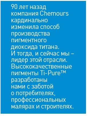 Правильный партнер также должен иметь возможность поставлять диоксид титана (TiO2) самого высокого качества. Компания «Кемурс» (Chemours) занимается этим уже почти столетие. С нашей мощной командой технических экспертов мы стояли во главе почти каждой инновационной разработки диоксида титана (TiO2) с момента возникновения этого рынка. Мы по-прежнему продолжаем применять проверенный научный подход и уделяем пристальное внимание каждому проекту, работаем в тесном сотрудничестве с нашими клиентами, что позволяет нам решать постоянно меняющийся набор задач и удовлетворять постоянно меняющийся набор требований клиентов. В наши дни, в нынешних условиях ведения бизнеса и нормативных требований, разработчикам рецептур и производителям красок необходимо использовать все преимущества и доступ к серьезным научным данным, которые помогут им оставаться впереди всех. Мы рады быть с ними на каждом этапе этого пути.