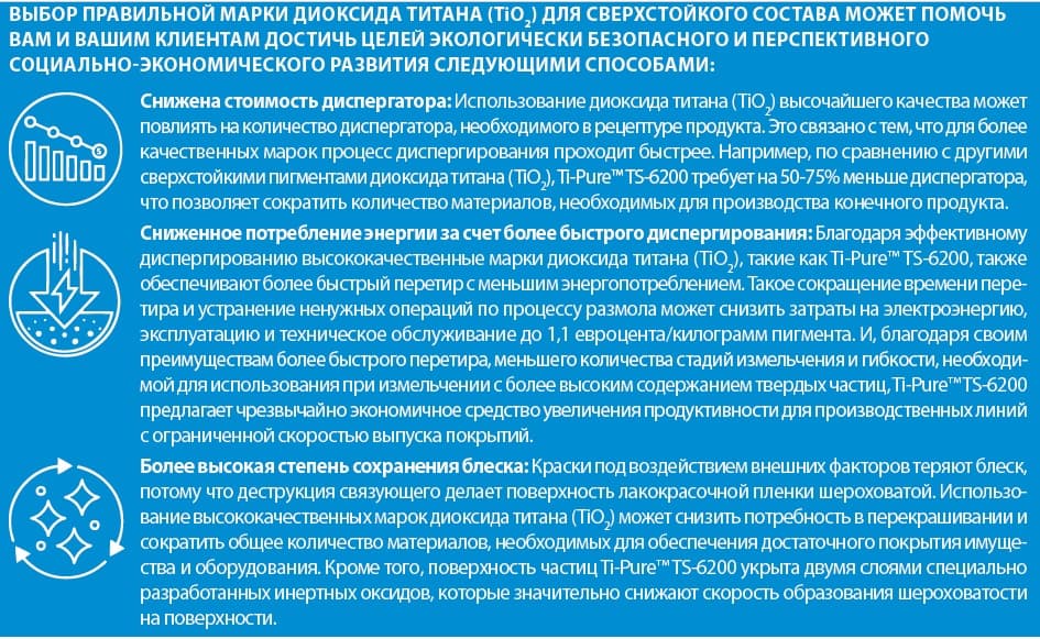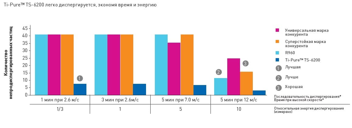 Вторая категория сверхстойких пигментов – это более современные марки, такая как Ti-Pure™ TS-6200, производства компании «Кемурс» (Chemours), которые, помимо замедления скорости образования радикалов, также несут в себе дополнительные преимущества более легкой и более полной диспергируемости. Как уже упоминалось выше, хорошо диспергированные частицы диоксида титана (TiO2) обеспечивают наилучшую защиту связующего от разрушающего действия УФ-излучения.
