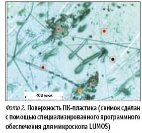 Одним из применений ИК-микроскопии является анализ включений в пластиках. Целью анализа в описанном далее примере было определение природы черных включений в виде полос на поверхности поликарбонатного (ПК) пластика. С помощью микроскопа LUMOS были зарегистрированы ИК-спектры с шести различных точек на поверхности образца со спектральным разрешением 4 см–1. Изображение поверхности образца приведено на фото 2, где цветными точками показаны позиции измерения. Полученные спектры представлены на рис. 1. Верхний спектр относится к ПК-матрице, средний – к включению, помеченному фиолетовой точкой на фото 2. Для определения химической природы включения был найден разностный спектр, так как спектр включения содержит четко выраженные линии ПК-матрицы. Нижний спектр на рис. 1 представляет собой результат вычитания. Поиск по библиотеке спектров выявил, что включения представляют собой черные чернила маркера.