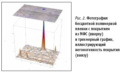 Всего было зарегистрировано 1200 спектров с временем измерения 3,5 с/спектр при разрешении 4 см–1. Для вычисления применялся факторный анализ по методу главных компонент, который способен выявлять даже визуально не различимые отклонения в спектральной информации, связанные с дефектами, микровключениями и т.п. В нижней части рис. 2 показан трехмерный график вклада спектра МФС в измеренные спектры, который отображает негомогенность распределения покрытия. Наиболее высокий пик на графике относится к видимому на фотографии синему пятну.
