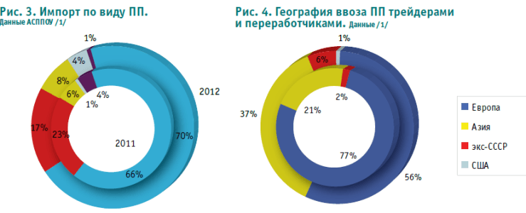 2. География ввоза пока не изменяется – лидируют поставки из ЕС. Переработчики ориентированы на европейский импорт в значительно большей мере, чем трейдеры (примерно в полтора раза), которые тяготеют к продукции из новых производств Азии, а также из СНГ и в гораздо меньшей мере – из США. В итоге доля азиатской продукции в 2012 г. выросла более чем вдвое.