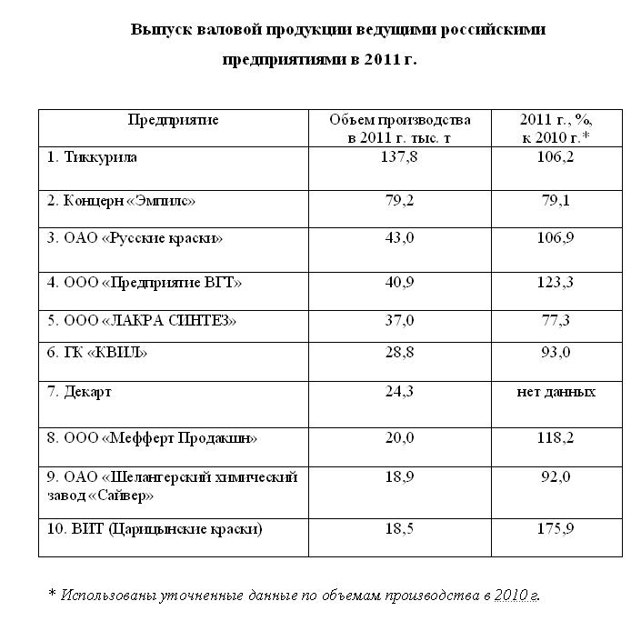 Состав «первой десятки» меняется в последние несколько лет незначительно, но динамика объемов производства каждого из предприятий отличается год от года. Причины этого различны: от работ по переоснащению и пересмотра ассортимента до «форс-мажорных» обстоятельств. Более высокими темпами в 2011 году росло производство водно-дисперсионных (ВД) ЛКМ. Их доля в общем объеме производства лакокрасочной продукции достигла 39%, а в сегменте декоративных ЛКМ 45%.