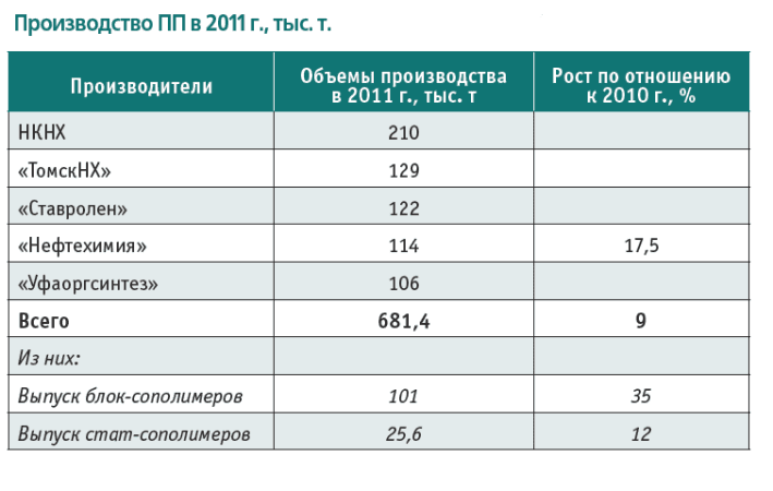 Традиционно российские производители выпускают гомо-полимер (80-85% производимого ПП), что делает рынок несамодостаточным. В последние годы наращивается выпуск сополимеров. Так, в 2011 году выпуск блок-сополимеров вырос более чем на треть (превысив 100 Кт – 15% производимого ПП), а стат- сополимеров – на 12% (до 26 Кт – 4% производимого ПП).
