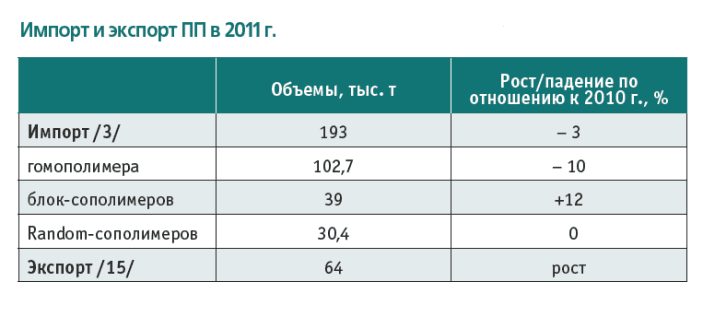 В 2011 году импорт ПП составлял 16,5% потребления. Это примерно 16+/–2 Кт в месяц – так было до лета, после чего произошел спад (до 12-14 Кт в месяц) вплоть до ноября. Затем началась активизация импорта (в декабре поставлен рекорд – почти 24 Кт) за счет поставок гомо-полимера из СНГ (Украина и Туркмения). В целом заметное сокращение спроса на гомо-полимербыло почти компенсировано ростом спроса на сополимеры (от продуцентов труб, изоматериалов, автопрома).