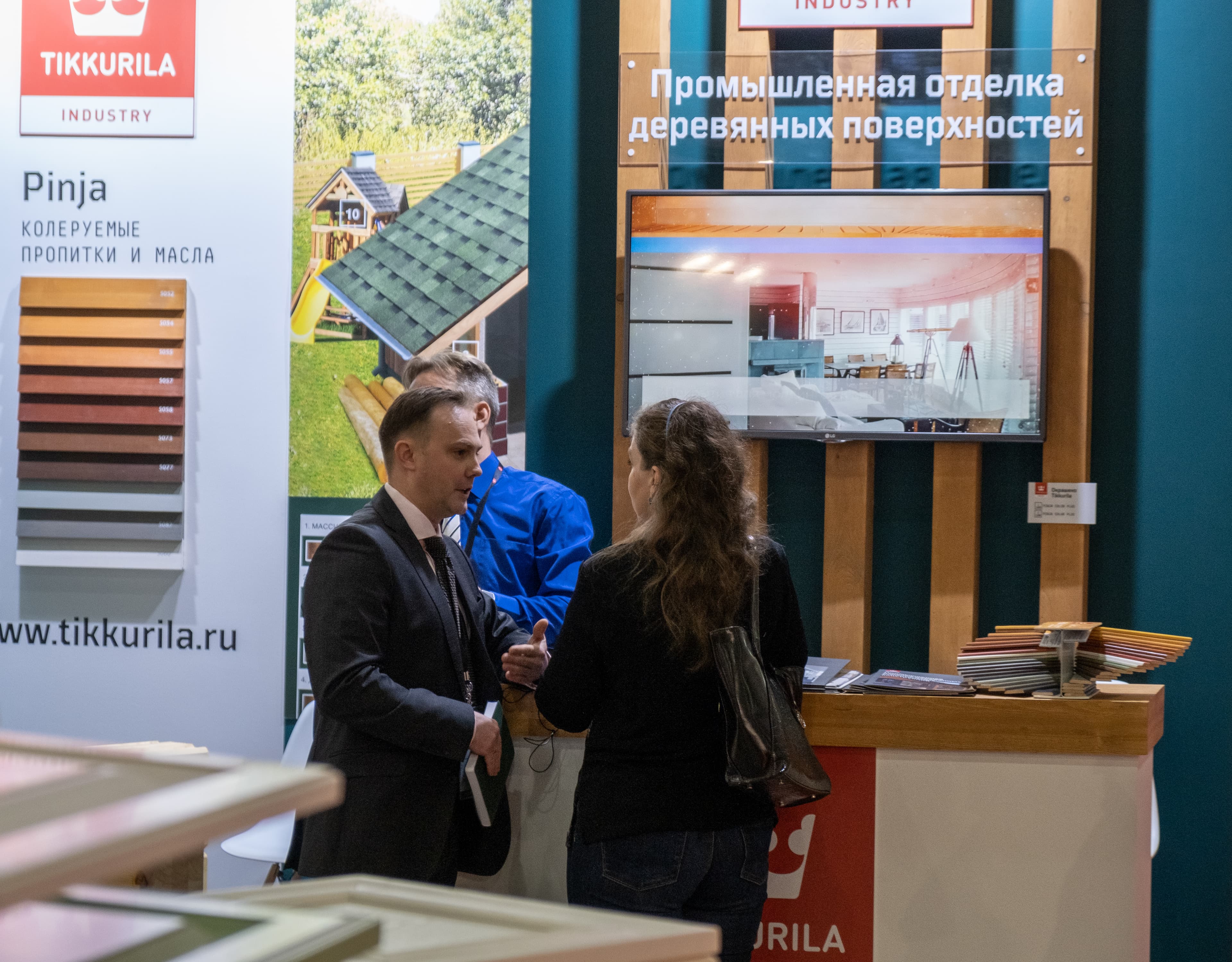 Концептуальный стенд наглядно представил экологичные и современные промышленные материалы и системы Tikkurila для окраски бруса, окон и других деревянных поверхностей. Работа на стенде оказалась насыщенной: здесь проходили переговоры с партнерами, интервью представителей компании организаторам, общение с потенциальными клиентами.
