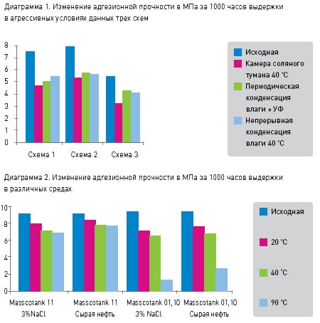 Для защиты металлических конструкций и технологического оборудования, эксплуатирующихся в условиях агрессивной атмосферы нефтеперерабатывающих, химических, металлообрабатывающих производств, компания «Индустриальные покрытия» предлагает использовать цинкпротекторные, эпоксиполиуретановые, полиуретановые системы с высоким сухим остатком. На диаграмме 1 показано изменение адгезионной прочности в МПа за 1000 часов выдержки в агрессивных условиях данных трех схем. Из диаграммы видно, что все системы имеют примерно одинаково высокие защитные характеристики покрытий, и только у чисто полиуретановой системы изначальная адгезионная прочность ниже, а также хуже стойкость в условиях соляного тумана.