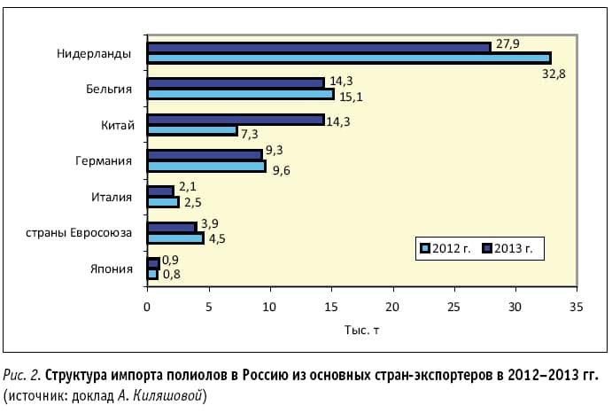 От анализа зарубежных рынков сырья для ПУ г-жа Киляшова перешла к отечественному рынку. Так, импорт в Россию полиолов в 2013 году (почти 73 тыс. тонн) остался практически на уровне 2012 году (рис. 1), однако изменилась его структура: сократился ввоз полиолов для эластичных ППУ одновременно со снижением импорта ТДИ (до 43,6 тыс. тонн), что связано с общим спадом в мебельной промышленности. Полиолы для жестких ППУ, напротив, продемонстрировали положительную динамику, как и МДИ (импорт вырос до 118 тыс. тонн, т. е. на 8–9 %); в целом этот сектор стал самым быстрорастущим. Основными поставщиками полиолов по-прежнему остаются Нидерланды и Бельгия, однако в 2013 году значительно выросла доля данного вида сырья, поставляемого из Китая (рис. 2).