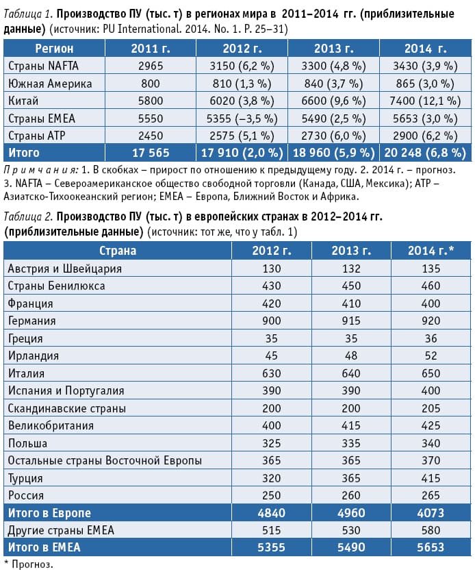В дополнение к приведенным данным в табл. 1 и 2 представлены сведения о производстве ПУ за последние годы в различных странах и регионах мира.
