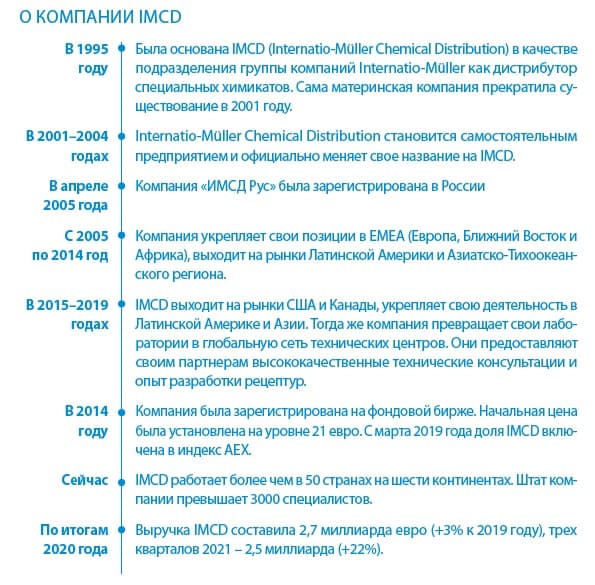 Компания IMCD представляет на рынке России и СНГ продукцию серьезных брендов, делает их доступными, предлагает качественный логистический сервис и техническую поддержку.