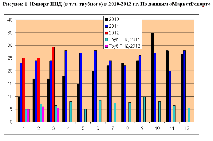 Почти 2/3 ПНД в России традиционно идет на изготовление покрытий стальных труб и производство ПЭ-труб, а с 2010 г. большой прирост показывает импорт пленочного упаковочного полиэтилена. В 2010 г. поставки ПНД выросли почти в 1,5 раза (на 47% к 2009 г.) – до 260 тысяч тонн, превысив показатель докризисного 2008-го (240 тысяч тонн). До июня показатели стагнировали на уровне 13+-2 тысяч тонн, но с июня 2010 г. начался рост, достигший рекордного пика в октябре – 35 тысяч тонн (не превышен до сих пор). Осенне-зимняя активность объяснялась тем, что татарские продуценты ПНД («Казаньоргсинтез» и «Нижнекамскнефтехим») встали на плановые профилактические работы.