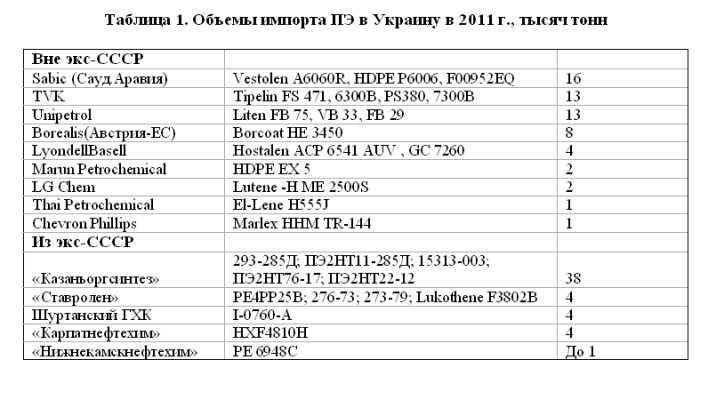 Импорт ПЭНД, в отличие от России, занимает наибольшую долю в закупках ПЭ. Ежемесячно импортируется порядка 10+-3 тысяч тонн из более чем 30 стран – в основном СНГ, Восточной Европы (Венгрии, Чехии и Румынии) и Саудовской Аравии. Крупнейшими поставщиками в 2011 г. были: «Казаньоргсинтез», TVK, Unipetrol, Sabic, Borealis (по объемам поставок Sabic идёт вторым, сразу после «Казаньоргсинтеза»). Это согласуется с данными АСППО, согласно которым наиболее крупными «несоветскими» поставщиками ПЭНД является тройка Sabic, TVK, Unipetrol, кстати, обеспечивающая свыше половины всего импорта ПЭ из дальнего зарубежья. Вместе с Borealis и LyondellBasel они дают 2/3 зарубежного импорта ПЭ и подавляющую долю импорта ПЭНД. Остальные крупные западные и восточные (Thai) компании служат скорее фоном, давая по 1-2% общего импорта ПЭ. Заметим, что ряд крупнейших импортеров ПЭ – Dow, Exxon, Hyundai, предлагают рынку только другие марки, прежде всего, ПЭВД. В Украину импортируется почти 20 марок ПЭНД от западных и восточных поставщиков.
