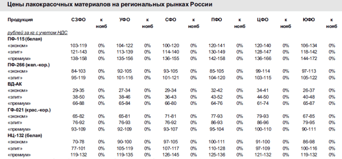 Невысокий спрос стал причиной того, что поставщики краски не стали менять его стоимость, и сейчас, ВД ЛКМ реализуются по ценам ноября. Более того, несмотря на то, что поставщики этой группы ЛКМ сократили поставки еще в октябре, на рынке сохранился профицит. И поэтому во второй половине прошлого месяца поставщики продукции начали предоставлять скидки при реализации некоторых позиций ассортиментного ряда, представленного на российском рынке. Дисконтная программа распространяется на ту продукцию, запасы которой на складах значительны. В целом же прайсовые цены до начала следующего года не изменятся.