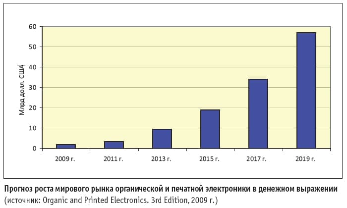 Последние десять лет мир переживает бум развития органической и печатной электроники; cотни компаний и научно-исследовательских институтов участвуют в гонке за новый рынок, который растет в геометрической прогрессии (см. рисунок) и, по прогнозам, через десять лет на порядок увеличится.