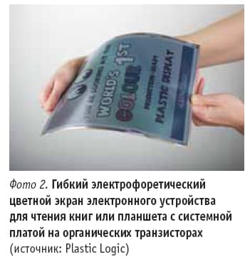 Следующий этап развития, который мог бы существенно продвинуть вперед электронные дисплеи, заключается в создании гибких (вплоть до сворачивания в трубку) электронных считывающих устройств и планшетов (фото 2), изготавливаемых без применения тяжелого и хрупкого стеклянного покрытия. В этом секторе лидирует британская компания Plastic Logic с полностью автоматизированной производственной базой в г. Дрездене, которая уже освоила искусство изготовления системных плат на органических тонкопленочных транзисторах, а следовательно, и активных матриц, необходимых для индивидуального управления яркостью отдельных пикселей экрана. Последним достижением в этой области является тонкий, легко гнущийся электронный дисплей с диагональю 10,7 дюйма, который при разрешении 150 точек на дюйм содержит TFT-матрицу размером 1280×960 пикселей, т. е. в общей сложности 1,2 млн. пикселей.