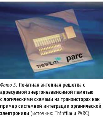 Системные компоненты органической электроники, которые благодаря своим уникальным свойствам могут быть интегрированы в традиционные электронные схемы, применяются в печатных носителях информации – таких как сегнетоэлектрические и не энергозависимые пленочные носители, предлагаемые ведущим финским производителем, компанией Th infi lm. Продвигаемые этой компанией разработки одновременно являются примером системной интеграции органических компонентов различных производителей в более крупные функциональные узлы, базирующиеся на общих печатных основаниях. В частности, путем комбинирования накопителей компании Th infi lm с печатными логическими схемами на транзисторах калифорнийской исследовательской компании PARC создается программно адресуемый модуль памяти (фото 5). Путем дальнейшего развития этой разработки в сочетании с печатными термисторами, панелью индикации исследовательского института Forschungsinstitut Acreo Swedish и печатными аккумуляторами могут создаваться компактные измерительные системы.