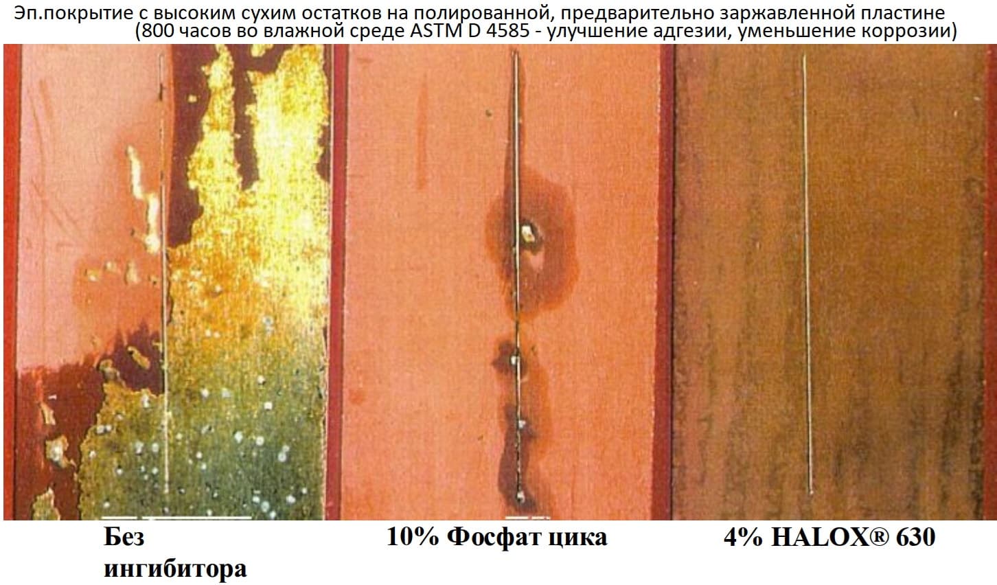 После отверждения покрытия, органические ингибиторы HALOX®остаются в плёнке в нерастворимой в воде форме, обеспечивая долговременную защиту от коррозии.