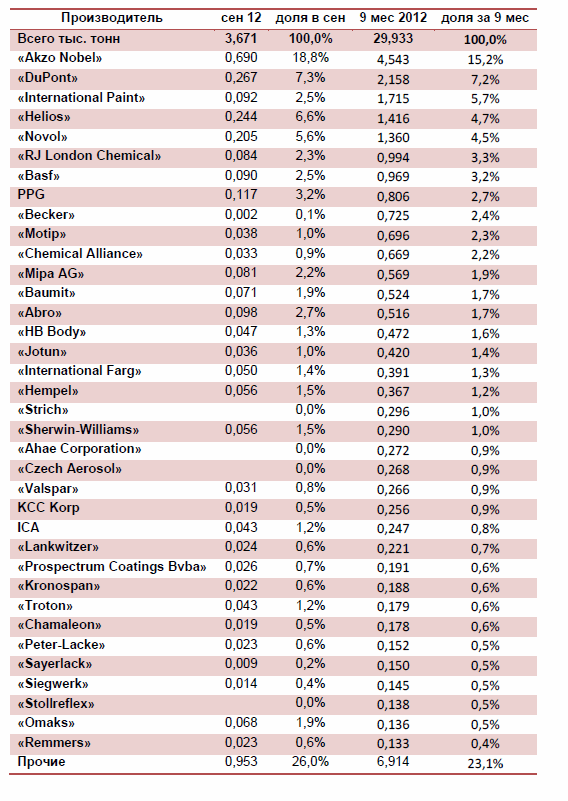 В структуре поставок ЛКМ на полимеризационных смолах преобладает продукция компании AkzoNobel. По итогам трех кварталов 2012 года поставки продукции производства этого предприятия составили 15,2%, а в сентябре – практически 19%.