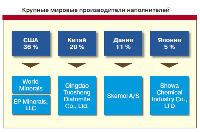 Мировой лидер в производстве диатомитовых земель, применяемых в различных отраслях промышленности - компания World Minerals, основанная в 1882 году в США и имеющая сегодня 26 производственных предприятий по всему миру, выпускает продукцию на основе кизельгура под марками Celite и Diafil. Что касается цен на диатомитовую продукцию, то наиболее высокую стоимость имеют функциональные наполнители композиционных материалов.
