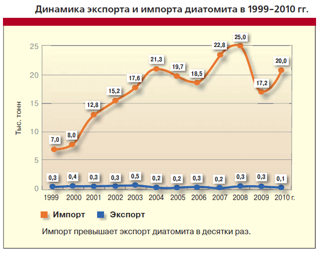 В то же время, растущий спрос на диатомитовую продукцию в стране удовлетворяется за счет импорта, объемы которого превышают экспорт диатомита в десятки раз. В стоимостном выражении импорт диатомита в 2010 году составил 12,636 миллионов долларов. Увеличение стоимостных объемов импорта связано главным образом с ростом объемов поставок материалов из диатомита с высокой добавленной стоимостью, в частности функциональных наполнителей. На протяжении нескольких лет крупнейшими поставщиками диатомита в Россию являются World Minerals, EP Minerals Llc и CECA S.A. — 50–70% всего российского импорта ежегодно.