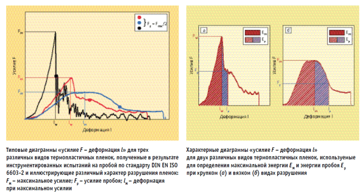 Для этого еще раз показаны красная и голубая диаграммы «усилие – деформация». По этим диаграммам в соответствии со стандартом DIN EN ISO 6603-2 определяются значения максимальной энергииEM и энергии пробояEp. Представленные диаграммы со всей отчетливостью позволяют выявить не только зависящие от особенностей материалов различия в значениях энергии, но и проблемы, которые могут возникнуть при их оценке в соответствии с нормами: неучтенными остаются достаточно значительные составляющие энергий деформации (их величина зависит от конфигурации кривых), соответствующие областям графиков, расположенным за произвольно фиксируемыми точками пробояFp (условно принимаемыми равными половине величиныFМ).