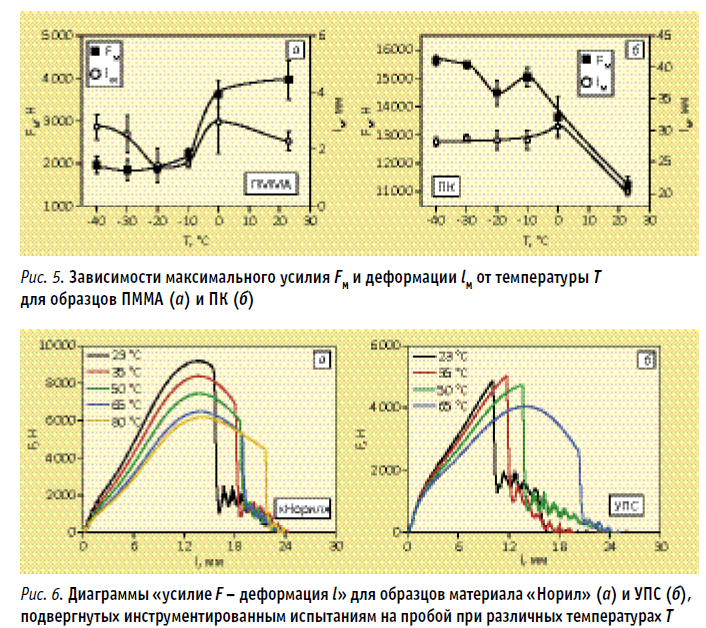 Учитывая обусловленную особенностями структуры ПМ зависимость их деформационных свойств от времени и температуры, часто считают, что с повышением температуры или продолжительности воздействия механической нагрузки способность материалов воспринимать эту нагрузку снижается при одновременном увеличении деформации. Как показали результаты исследования пластифицированного ПВХ, ПММА и ПК, это предположение нельзя считать верным для всех случаев без исключения. Методические аспекты инструментального испытания на пробой и соответствующего анализа получаемых результатов были рассмотрены с учетом данных исследования материала «Норил» (Noryl) и модифицированного с целью повышения ударной вязкости ПС (HIPS: high impact polystyrene). В качестве примеров представлены кривые «усилие – деформация» для обоих ПМ, снятые при различных температурах.