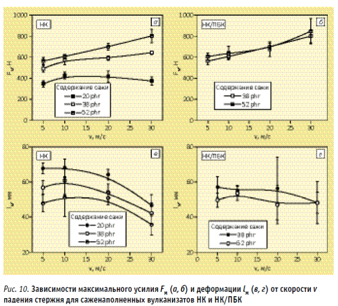 Аналогичные выводы можно сделать также при анализе, на котором представлены графики зависимости усилияFМ и деформацииlМ от скоростиvпроведения испытаний, соответствующие наполненным вулканизатам НК и смеси НК/ПБК с различным содержанием наполнителя. Во всех случаях, за исключением вулканизата, содержащего 20 phr сажи («phr» – здесь и далее «массовых частей на 100 масс. ч. основного материала), значениеFМ непрерывно увеличивается по мере повышенияv. ВеличинаFМ в случае вулканизатов НК зависит от содержания серы. У смеси НК и ПБК, взятых в соотношении 60:40, содержание серы в выбранном диапазоне ее варьирования практически не оказывает влияния на величину максимального усилия. Аналогичные выводы можно сделать и в отношении деформируемости материалов: полученные при испытаниях образцов из гомополимеров и смеси полимеров результаты существенно различаются. В то же время величина показателяlМ для вулканизата НК приv= 30 м/с существенно снижается, а показатели деформируемости образцов из смеси остаются почти неизменными (по сравнению с образцами из гомополимера) даже при самых высоких значениях скорости стержня.