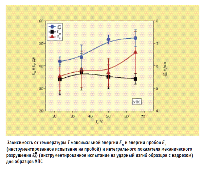 Из всего вышеизложенного следует, что наиболее содержательная информация о свойствах данной системы материалов в выбранном температурном диапазоне может быть получена только при описании их поведения при разрушении с применением нескольких параметров, определяемых в результате комплексного использовании обоих методов инструментированных испытаний – на пробой и на ударный изгиб образцов с надрезом. В качестве еще одного примера для материала «Норил» представлены результаты измерения показателейEM иEP, полученные с применением метода испытания на пробой, в сравнении с результатами определения сопротивления распространению трещины, полученными в ходе испытания на ударный изгиб образцов с надрезом в соответствии с требованиями норм по испытаниям ПМ, разработанными Университетом имени Мартина Лютера (г. Халле-Виттенберг).