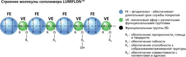 LUMIFLON™- фторполимер, созданный и производимый компанией AGC Chemicals с 1982 года. Основу LUMIFLON™ составляют регулярно чередующиеся звенья фторэтилена (FE) и винилового эфира (VE), сополимеры этого типа также сокращенно называют FEVE. Фторэтилен обеспечивают долговечность и высокую химическую стойкость, в то время как виниловый эфир обеспечивает прозрачность, гибкость, сшиваемость и высокую адгезию. За счет сочетания этих свойств LUMIFLON™ обладает высокой УФ- и атмосферо- и химической стойкостью, способностью к пигментированию в практически любые цвета с высоким глянцем и растворимостью.