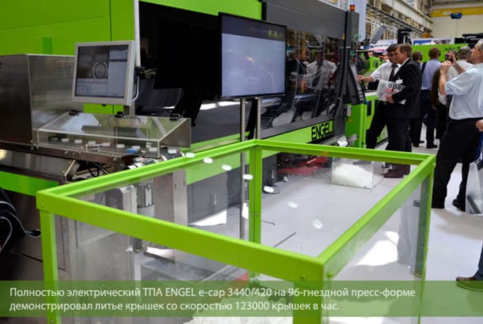Полностью электрическая машина e-cap 3440/420 продемонстрировала высокоскоростное литье крышек из ПЭВП: в 96-гнездной форме производилось 123 тысячи крышек в час со скоростью впрыска до 460 мм/с и временем цикла 2,8 с.