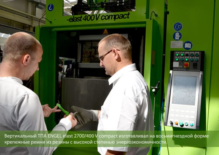 Компактная гидравлическая вертикальная машина elast 2700/400 V compact изготавливала в восьмигнездной форме крепежные ремни из резины с малым для подобных материалов временем цикла – около 80 с – и низким потреблением энергии. Высота рабочего стола над полом составляет всего 775 мм, что существенно облегчает доступ и обслуживание.